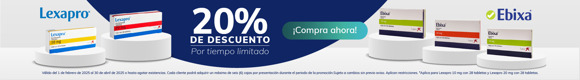 Compra ahoraVálido del 1 de febrero de 2025 hasta el 31 de marzo de 2025 o hasta agotar existencias. Cada cliente podrá adquirir un máximo de seis (6) cajas por presentación durante el periodo de la promoción. Sujeto a cambios sin previo aviso. Aplican restricciones. *Aplica para Lexapro 10 mg con 28 tabletas y Lexapro 20 mg con 28 tabletas