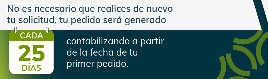 Al generar tu pedido, selecciona la opción de suscripción y elige la periodicidad en la cual requieres el medicamento. Al tratarse de una suscripción, estas aceptando que se realice un cargo recurrente según la periodicidad que hayas elegido.